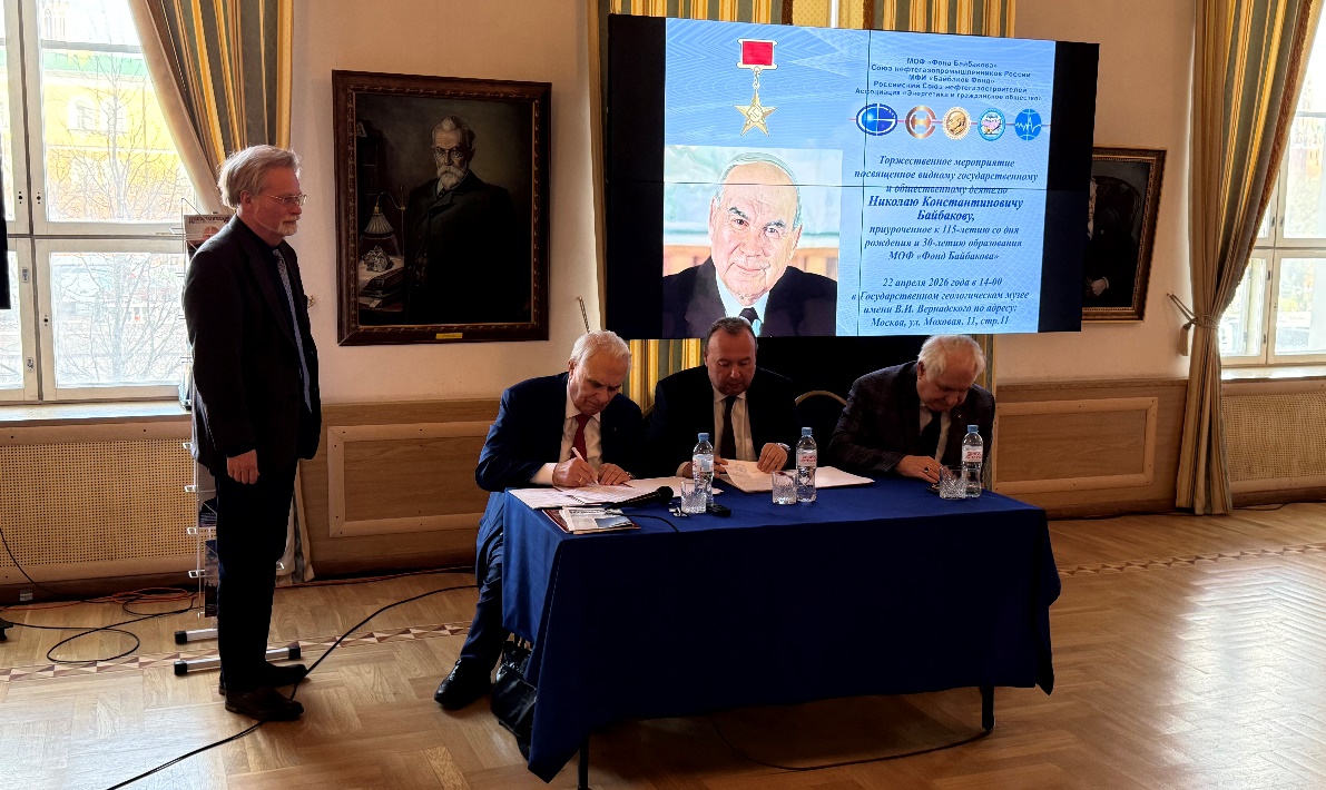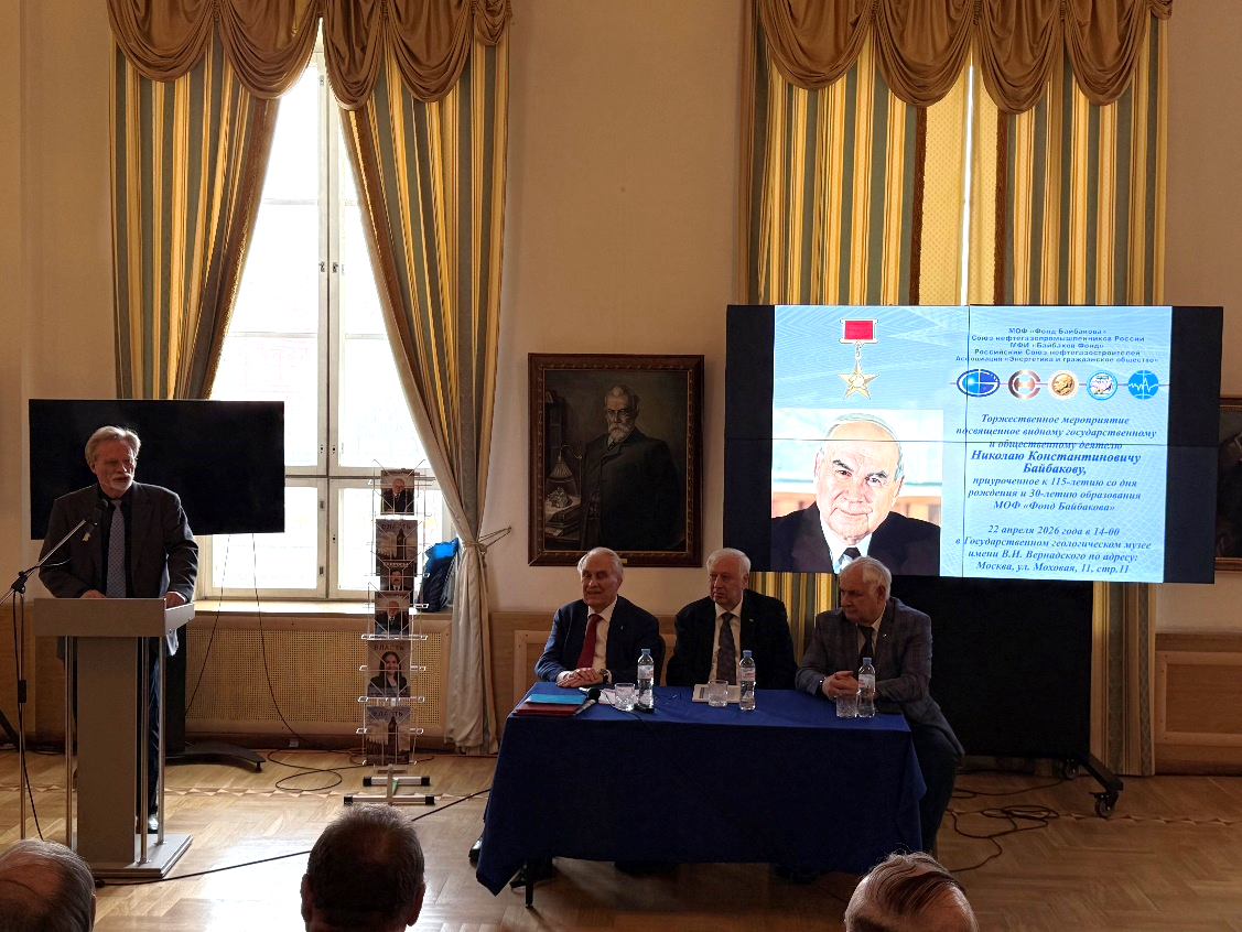 22 апреля 2026 года в Государственном геологическом музее имени В.И. Вернадского состоялось торжественное мероприятие, посвященное 115-летию со дня рождения легендарного советского государственного деятеля, Героя Социалистического Труда Николая Константиновича Байбакова. В чествовании Н.К. Байбакова приняли участие директор, профессор РАН Э.С. Закиров и заместитель директора по научной работе, член-корреспондент РАН В.И. Богоявленский.